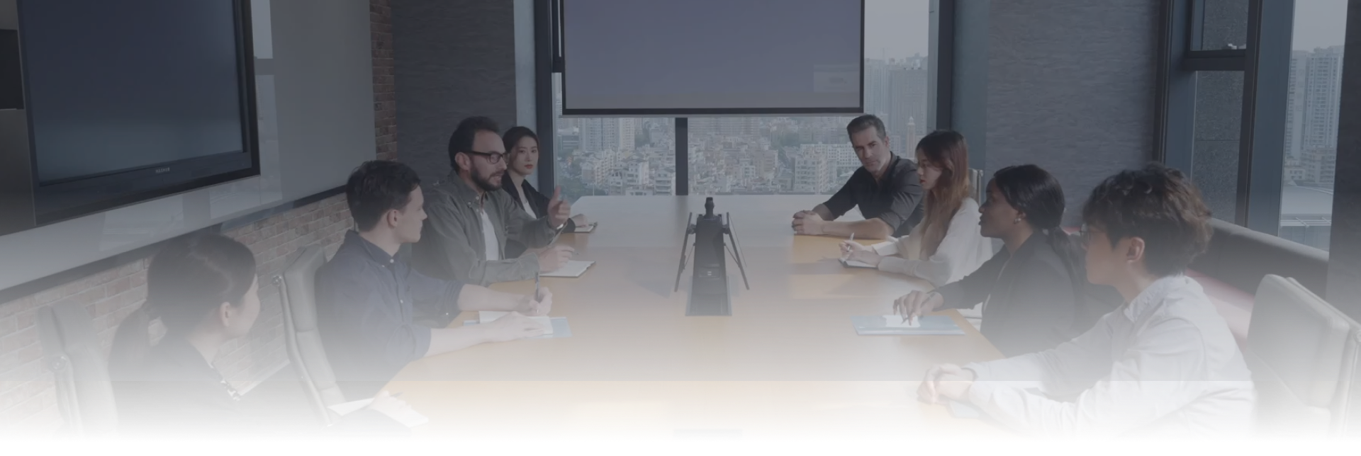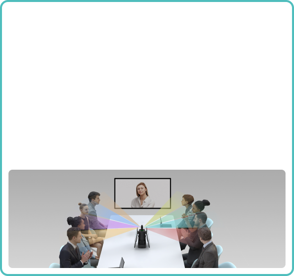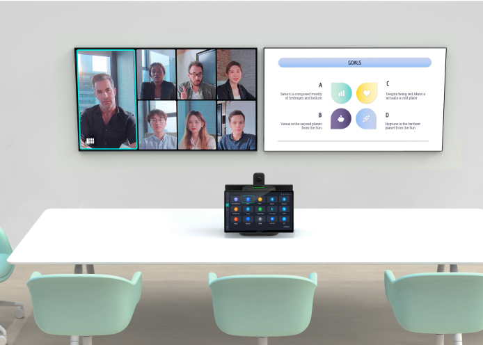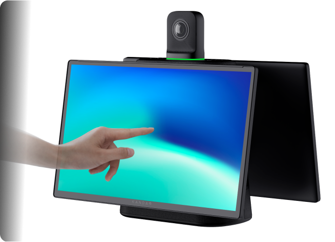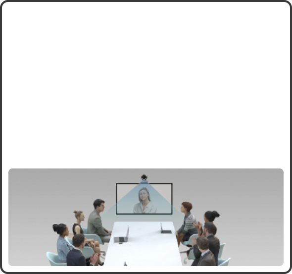 Positioning two FHD screens right underneath the camera creates a more face-to-face collaboration by displaying the meeting right in front of you while showing the front face of local users to the remote attendees.