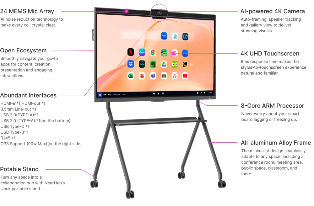 IMMERSIVE MEETTING THAN EVER: With a 24-element microphone array and 120° wide-angle 4K AI camera, NearHub meeting room smart board offers versatile camera modes like Gallery View, Speaker Tracking, and Auto Framing for a more immersive hybrid meeting experience.