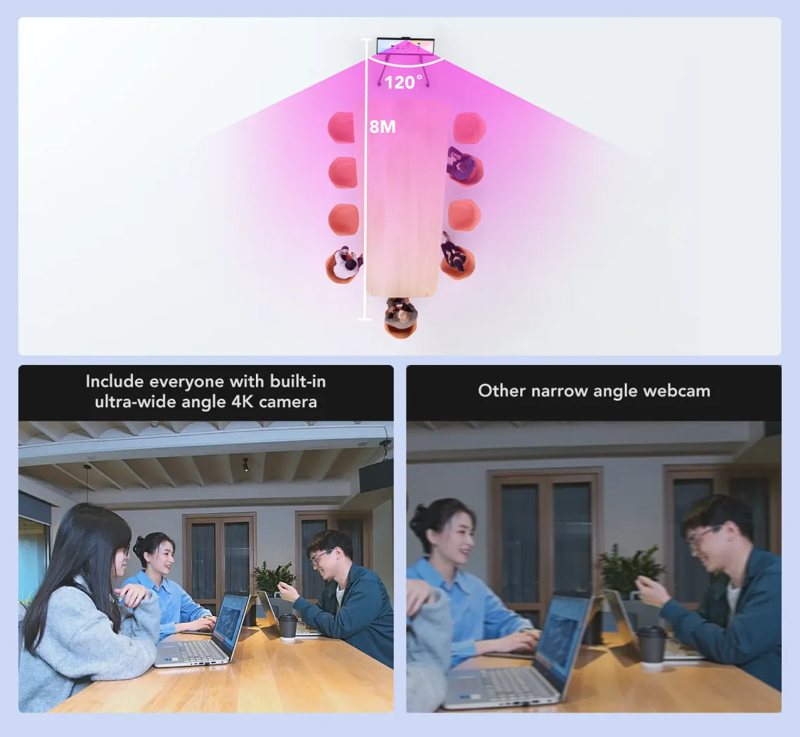Ensure everyone is part of the conversation using our custom-designed 120° ultra-wide lens. Every participant can experience superior video quality, enhanced detail, and a professional appearance with 4K HD resolution on the smart whiteboard for office.