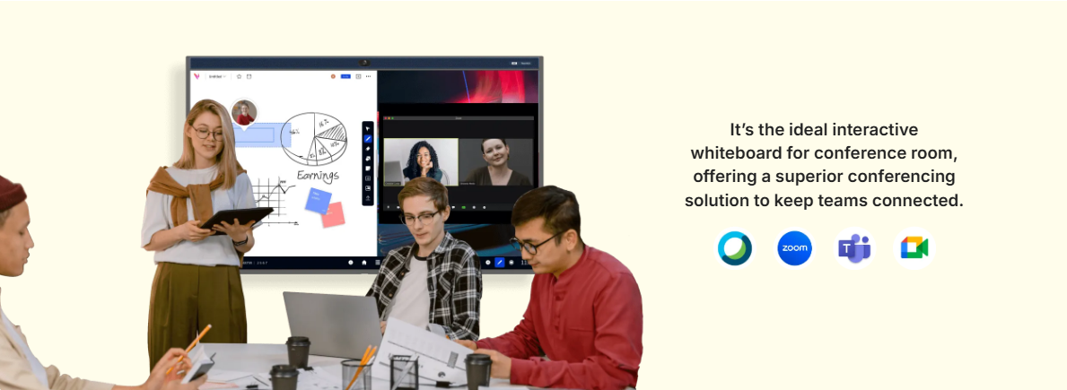 The smart board for conference room offers versatile camera modes, including Auto-Framing and Gallery Mode, to create a more immersive hybrid meeting experience. Everyone is featured clearly, whether they’re in the room or joining remotely.